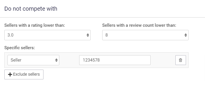 Der Repricer filtert die Konkurrenten heraus, die in den Einstellungen "Nicht konkurrieren mit" der Repricer-Regeln ausgeschlossen wurden.