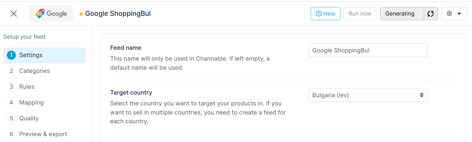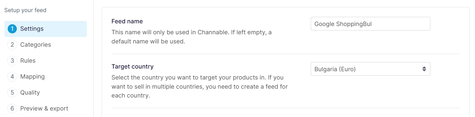 Once your data is updated and ready, navigate to [your feed] > Settings and update the Target Country to “Bulgaria (Euro)”.
