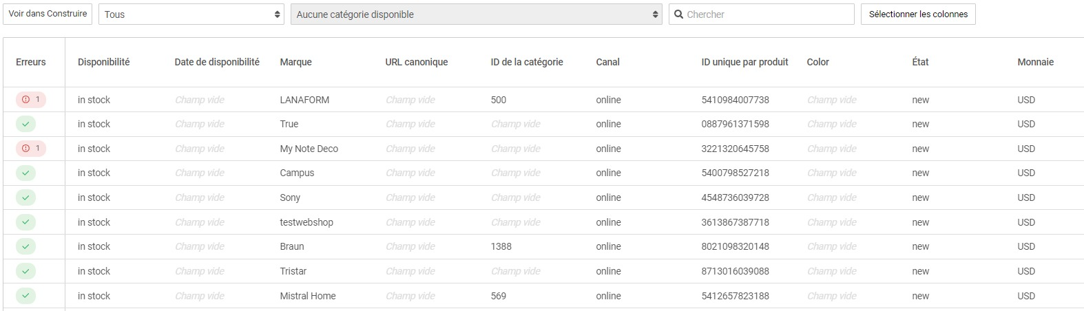 - Rechercher et filtrer : Recherchez des produits spécifiques ou filtrez par message d'erreur/catégorie.