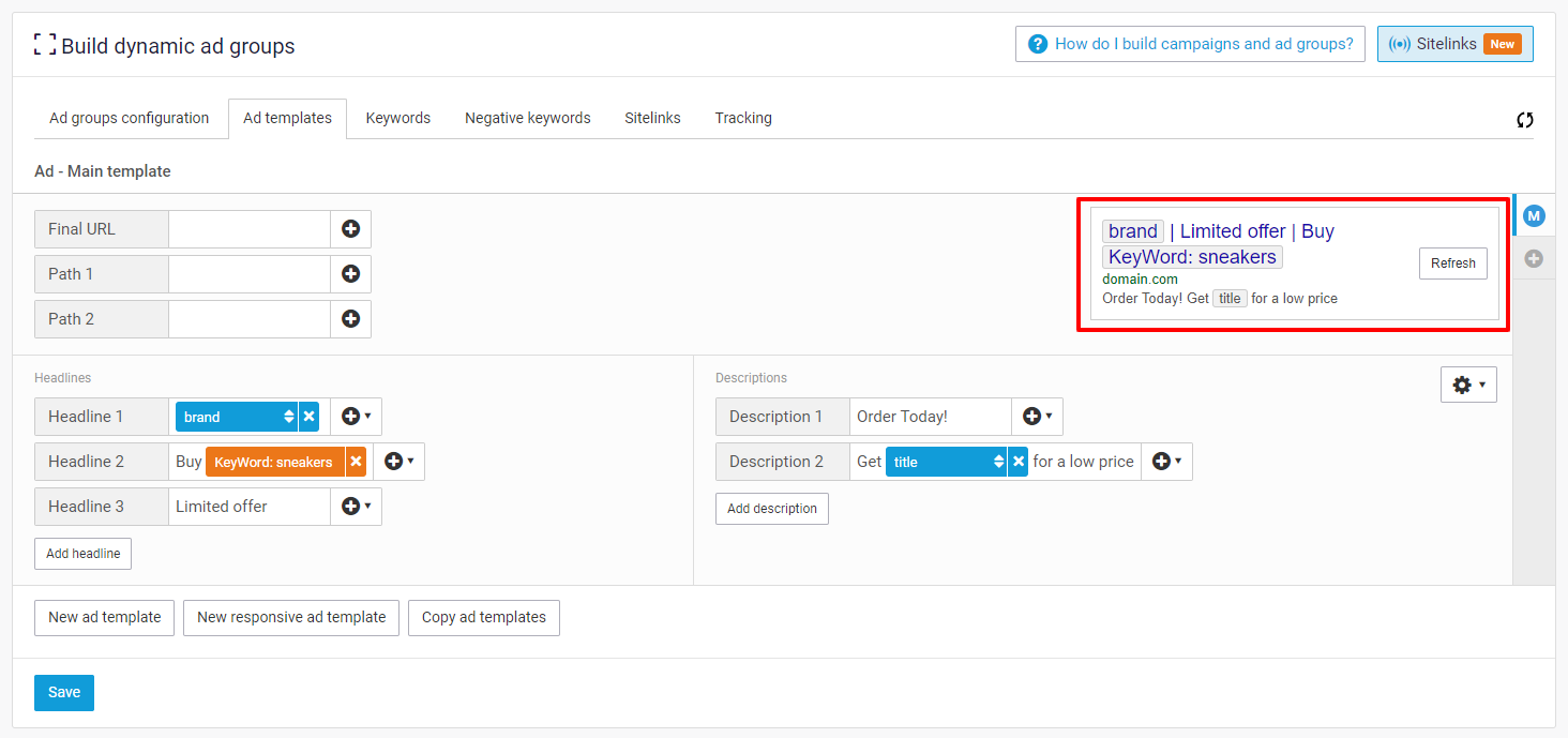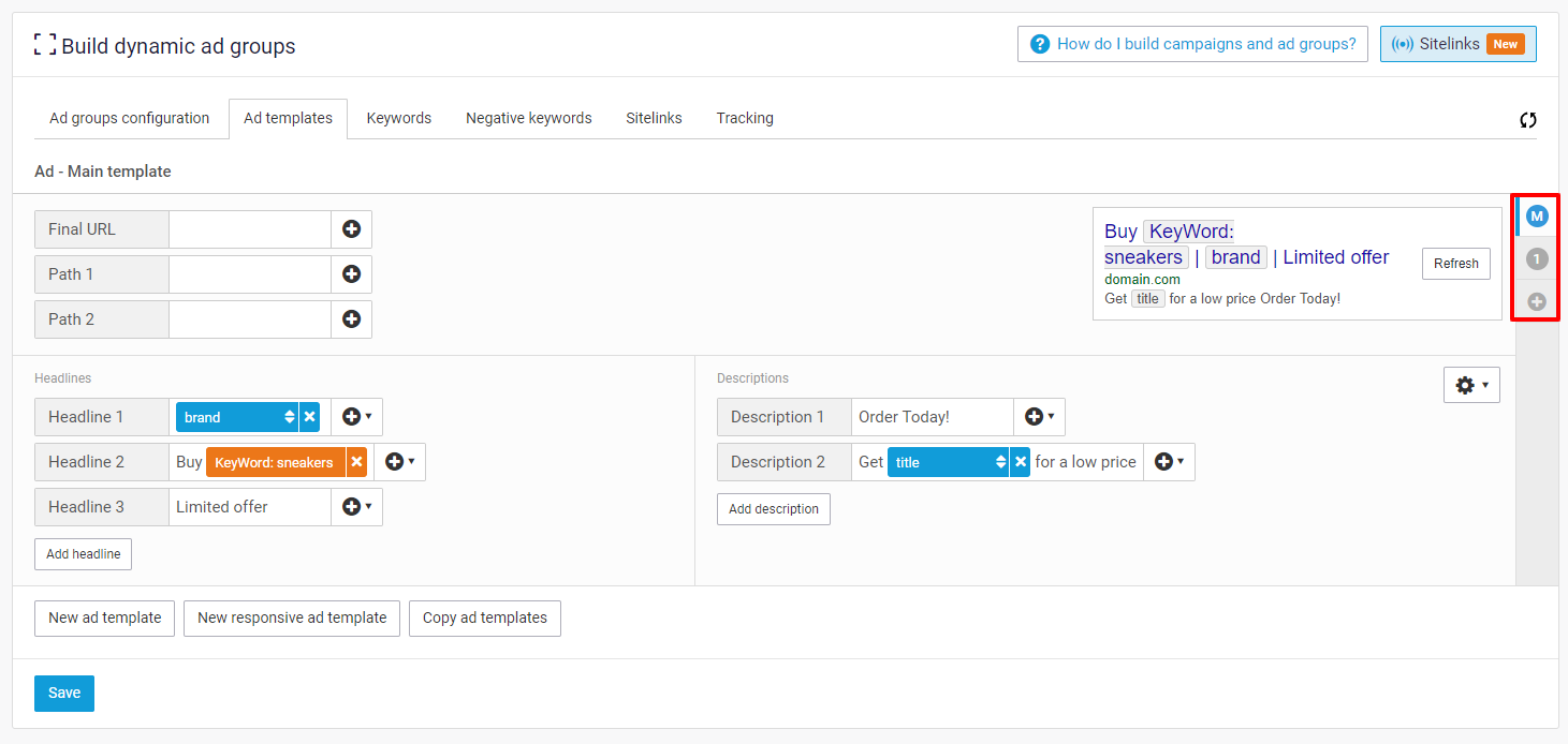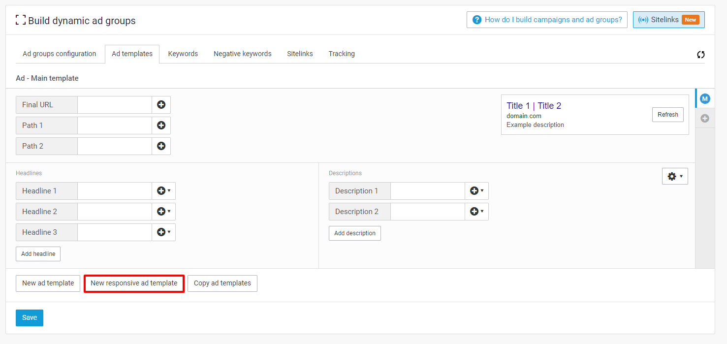 Creating your Google Ads is done in the campaigns and Ad groups steps of your generator. To set up the main part of your ad navigate to the Ad templates tab within the Ad groups step.