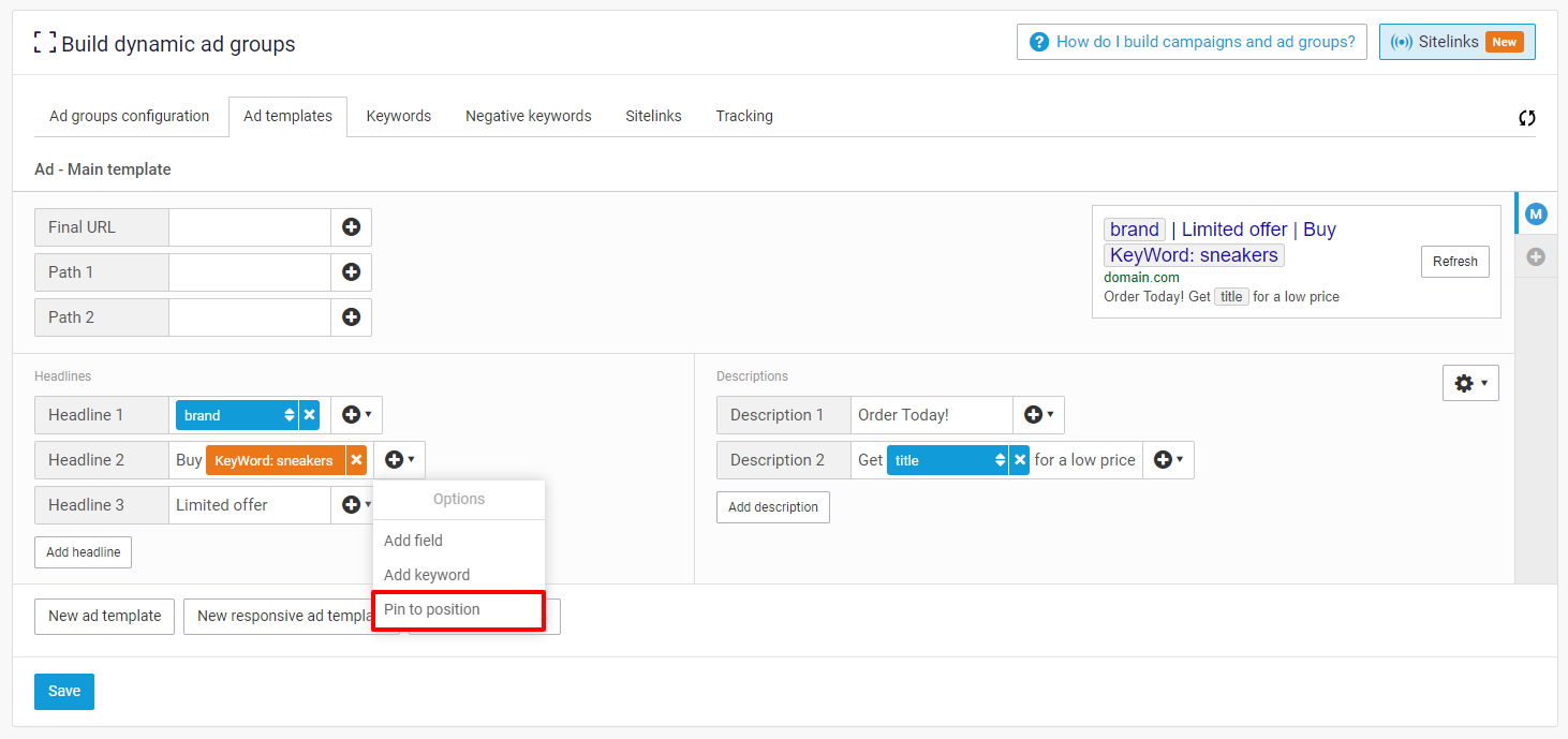 While filling in assets you can use dynamic fields and keyword insertion to use item information and further customize ads. For keyword insertion details see: How do I use keyword insertion in an Ad template?