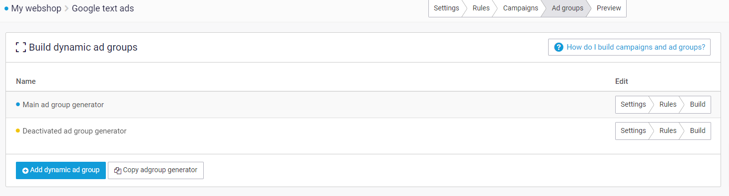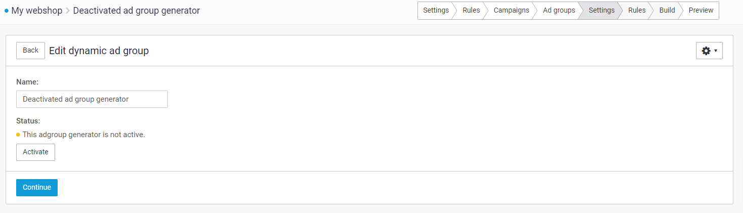 You can add new ad group generators without deactivating the whole ad generator and pausing campaigns as a result. New ad group generators are created deactivated.