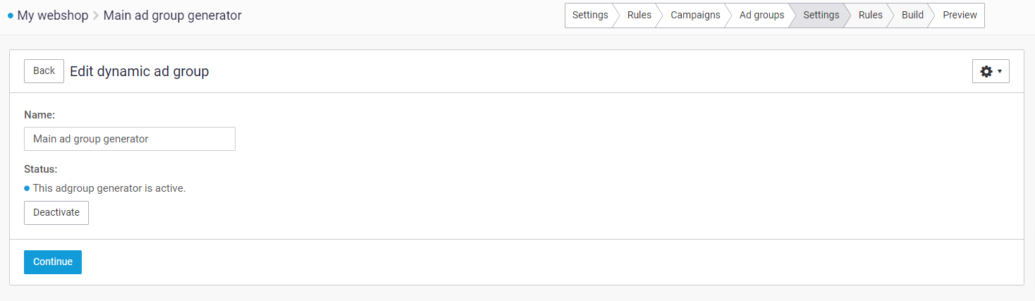 Deactivating an existing ad group generator results in the opposite of activating it. It will prevent new objects from being created on Google, the ones that already exist on Google will be paused and special labels will show up in the preview instead of the statuses.