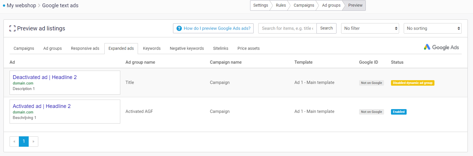 Objects that are generated by activated ad group generators are activated. The ones generated by deactivated ad group generators are deactivated. Deactivated objects have a special status in the preview which helps to distinguish them from the activated ones that just have their Google status.