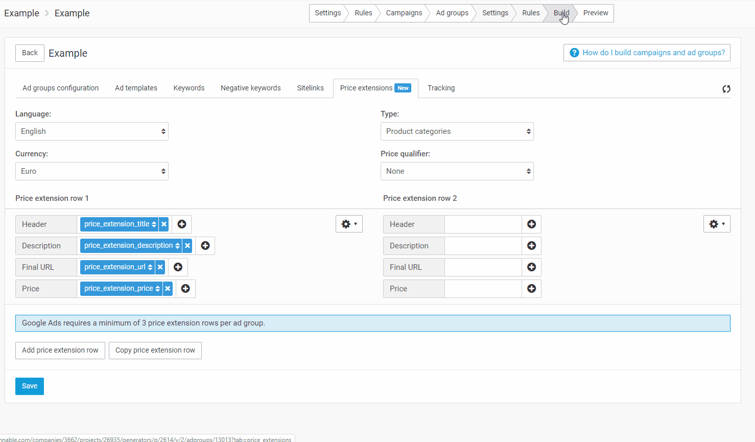 Para añadir extensiones de precio a tus anuncios, ve al El paso de paso en tu generador de anuncios, y verás una pestaña llamada Extensiones de precio. Aquí puedes crear tus extensiones de precio. Al configurar las extensiones de precio, debes establecer un idioma, moneda, tipo y calificativo de precio.