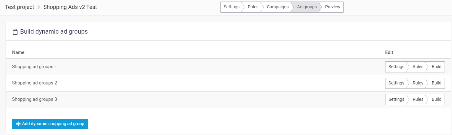 Pour chaque générateur de groupe d'annonces Shopping, vous pouvez configurer les Paramètres, les Règles et Construire. Dans l'étape Construire, vous créez des subdivisions de groupe de produits, ce qui est important lorsque vous utilisez plusieurs générateurs de groupes d'annonces Shopping. Pour un guide détaillé sur la configuration du groupe d'annonces Shopping, voir cet article.
