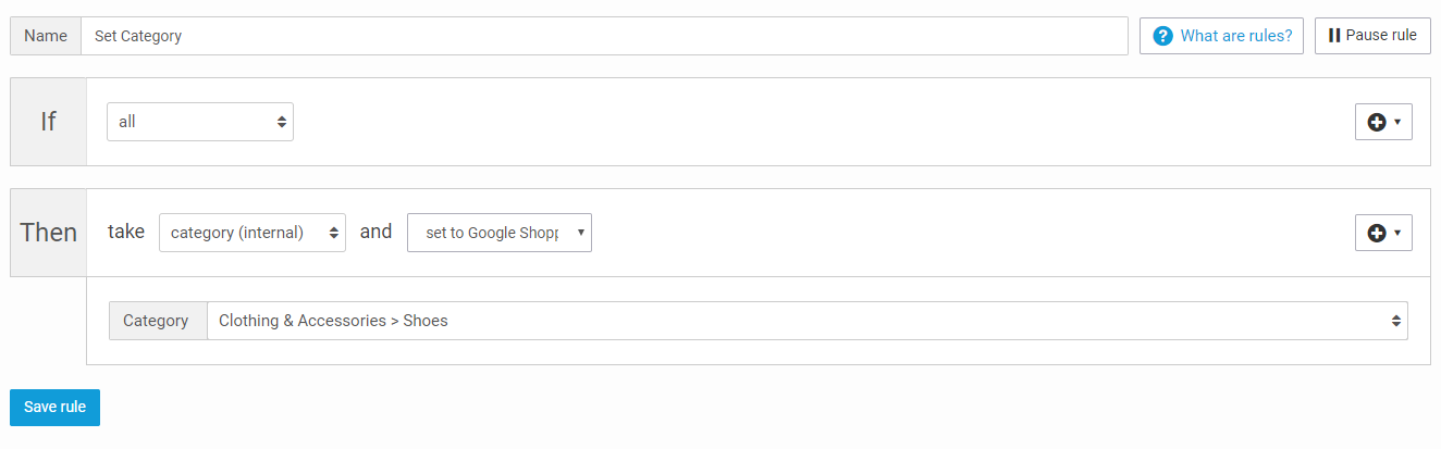 La règle "définir la catégorie" sert d'alternative à l'étape "catégories" présente dans chaque canal d'exportation. En général, l'étape catégories est la plus simple pour attribuer la catégorie du canal d'exportation à vos produits, mais dans certains cas les règles permettent d'obtenir le résultat plus rapidement et/ou plus précisément.