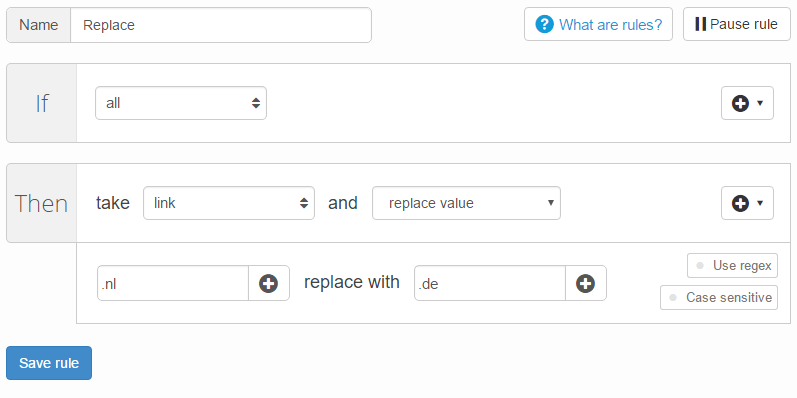 You could, for example, use the "replace value" rule to change your Dutch URLs to German URLs. This example is shown in the screenshot below.